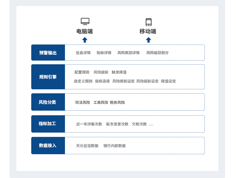 以各地方政府征信数据指标为基础,融合金融组织内外部数据建立预警指标,建立精准科学的贷后预警引擎,覆盖金融组织的企业客户的贷后全程风险监测与贷后管理工作